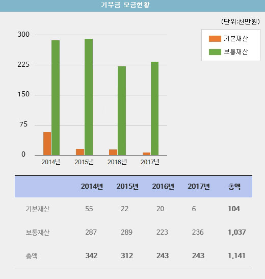 서울공대 교육연구재단의 지난 4개년 간 기부금 총 모금 현황(기본재산 및 보통재산 모금현황)은 아래와 같습니다.(2017년 12월말 기준)